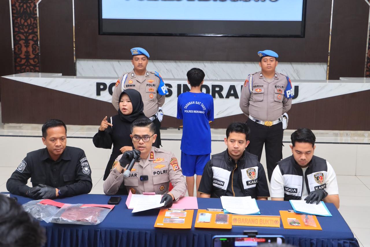 Press release pengungkapan kasus dipimpin langsung oleh Kapolres Indramayu AKBP Mochamad Fajar Gemilang, S.I.K,. M.H., M.I.K., didampingi Kasat Reskrim AKP Muchammad Arwin Bachar, S.T.K., S.I.K., serta Kasi Humas AKP Tarno, S.H., di Aula Atmaniwedhana Polres Indramayu, Kamis (4/12/2025).