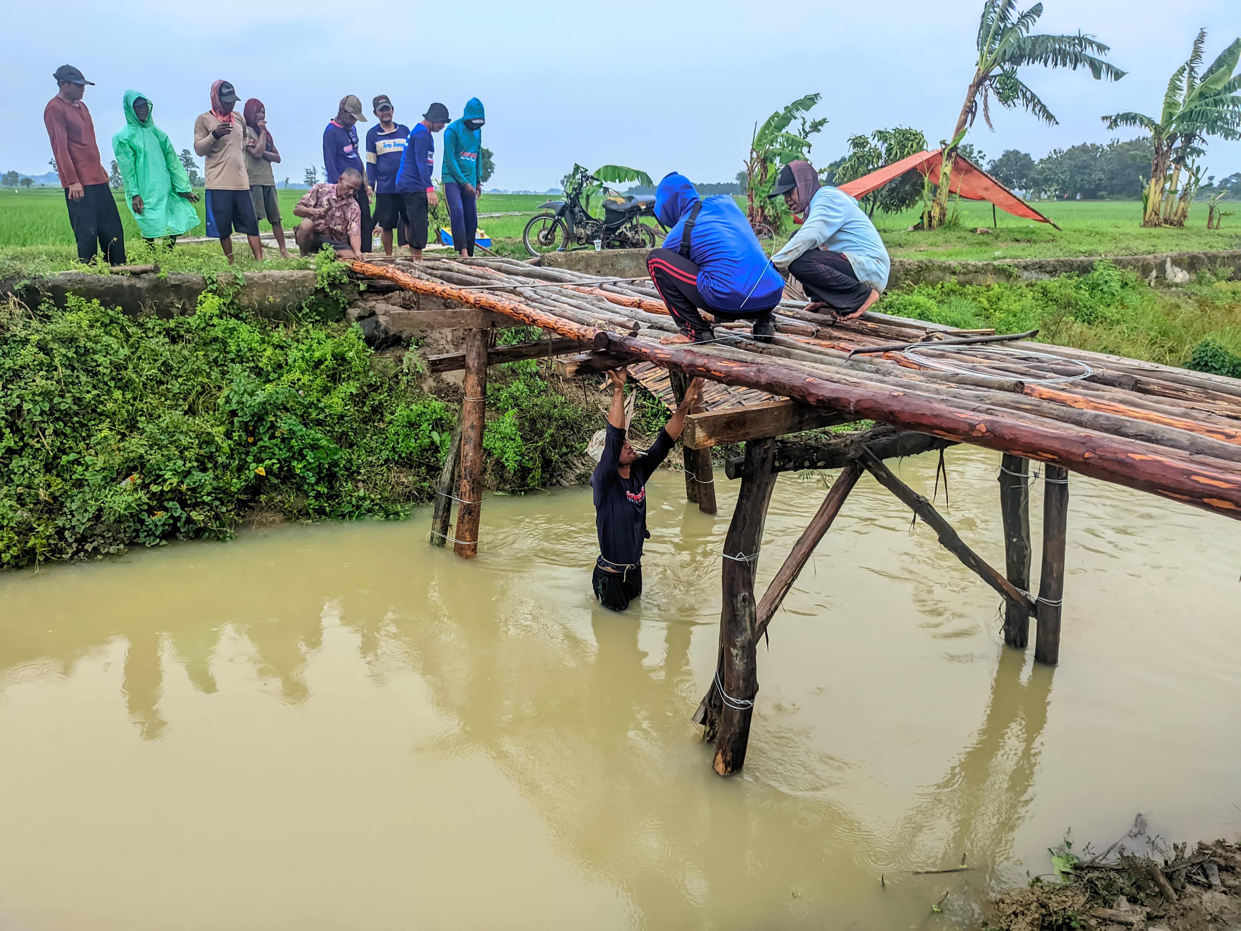 INDRAMAYU, anmnews.id - Kuwu Jatimulya, Kecamatan Terisi, Kabupaten Indramayu, Provinsi Jawa Barat, bersama Raksa bumi (Adi winarto), mitra chai (Wahyudin), Syarip, Rohedi, warga, para petani, Ketua kelompok tani (Nuridin) dan Toip, giat laksanakan rehab jembatan darurat menggunakan bambu di sungai widuri panjang 12 m lebar 2,5 m dengan menggunakan bambu, walaupun diguyur hujan sejak tadi pagi hingga kini, dingin menusuk tulang, warga tetap semangat, Kamis, 22/1/2026.